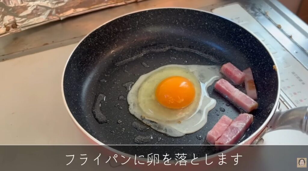 ご飯はレンジで温め、ベーコンをよく炒めてからフライパンに卵を落とします。