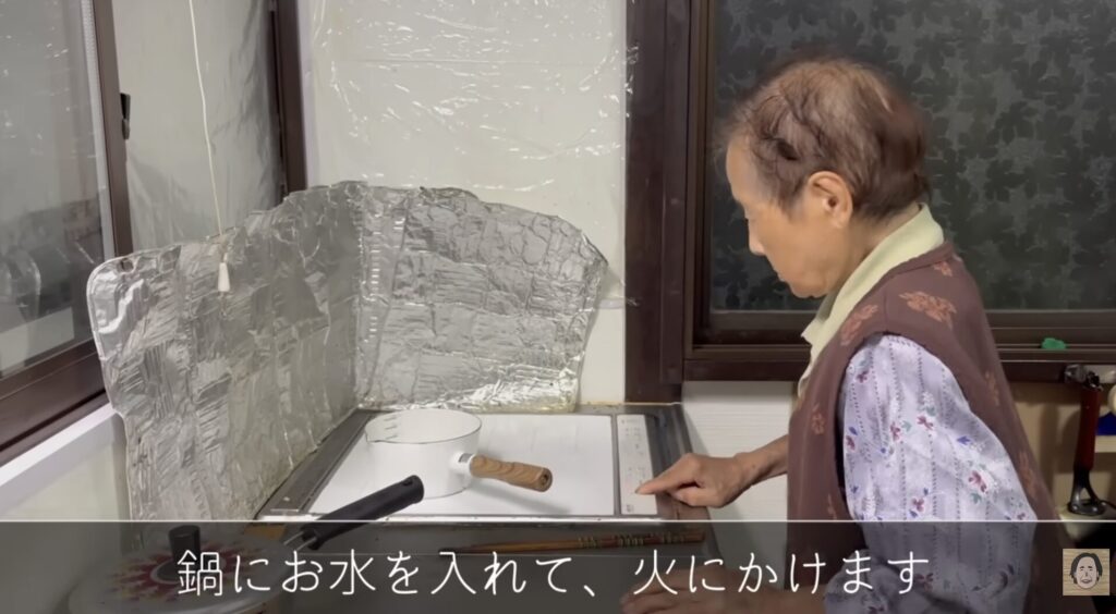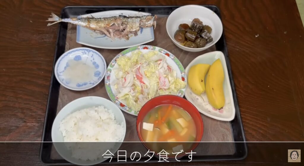 おばあちゃんが、お味噌汁、サラダ、そして秋刀魚の塩焼きを丁寧に準備します。