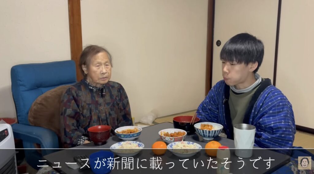 食事中、おばあちゃんが新聞の記事について教えてくれました。
