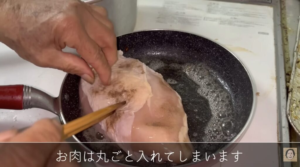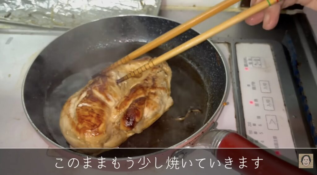 鶏肉は、大きな塊のままフライパンで焼いていきます。
